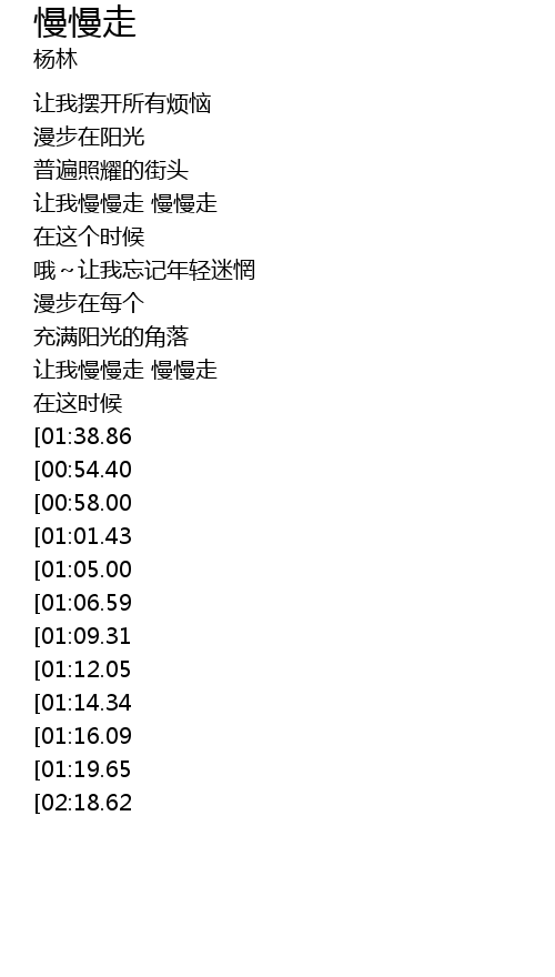 | [02:01.60][01:16.09] | 让我慢慢走 慢慢走 |