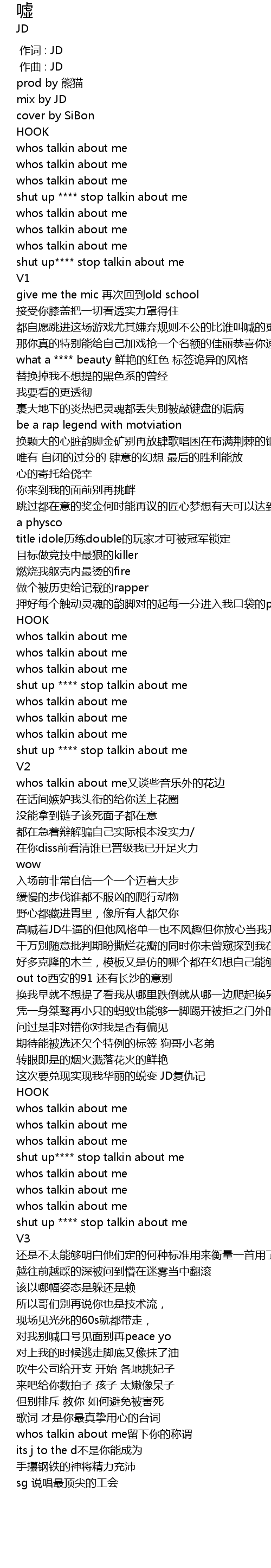 | [02:36.462] | 好多克隆的木兰,模板又是仿的哪个都在幻想自己能够跨栏,拜托又不是大腕的级别shout out to西安的91 还有长沙的意别 |