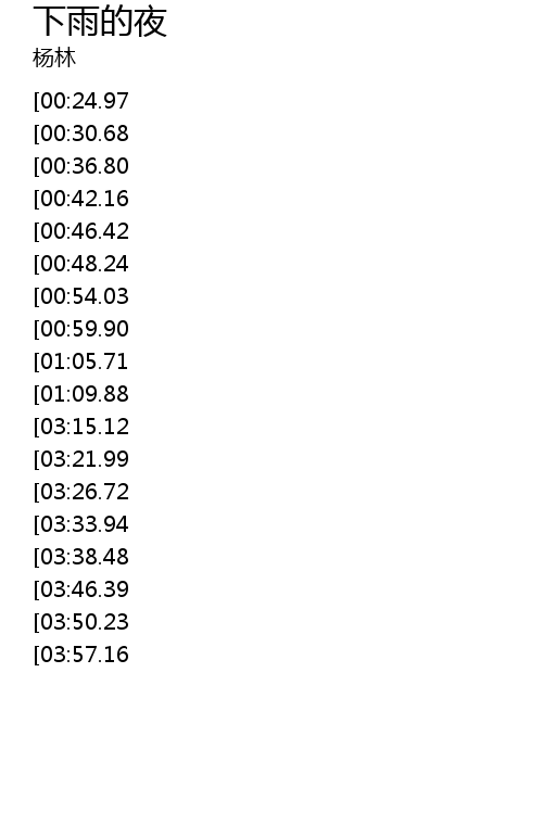 | [02:25.14][00:24.97] | 又是 一个下雨的夜 |