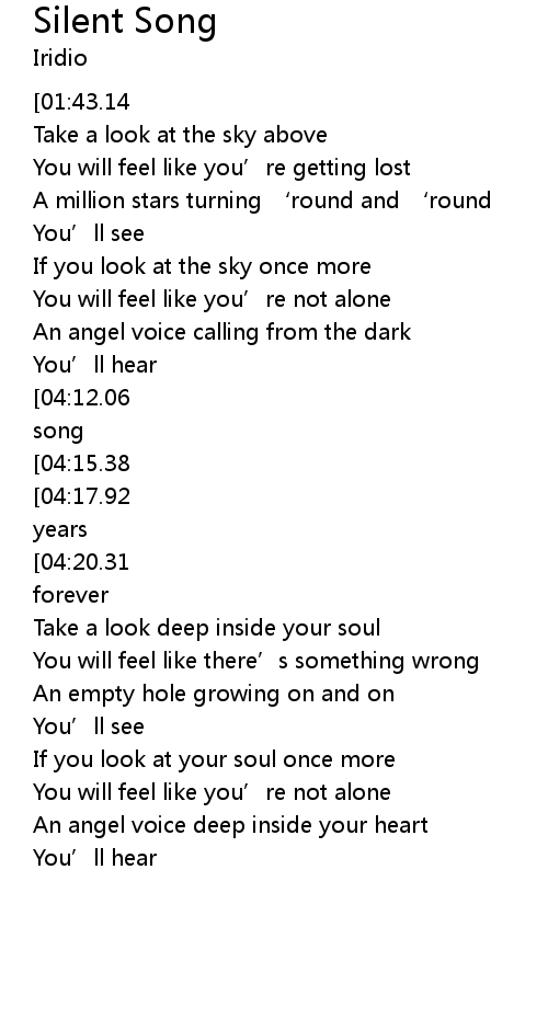 | [04:26.17][04:12.06][03:57.15][03:43.07][01:29.60][01:15.29] | Listen to my silent song |