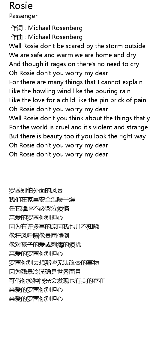| [00:17.47] | Well Rosie don't be scared by the storm outside |