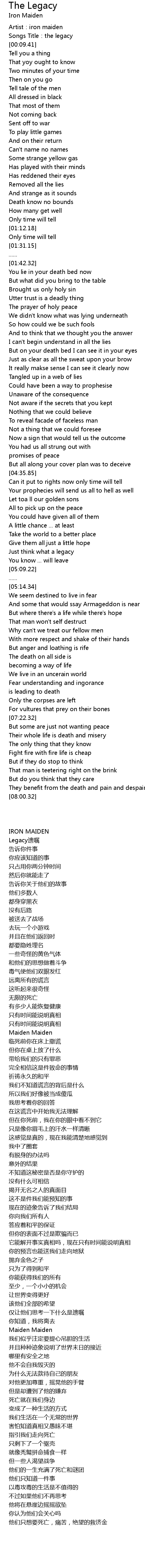 | [00:02.86] | Artist:iron maiden |
