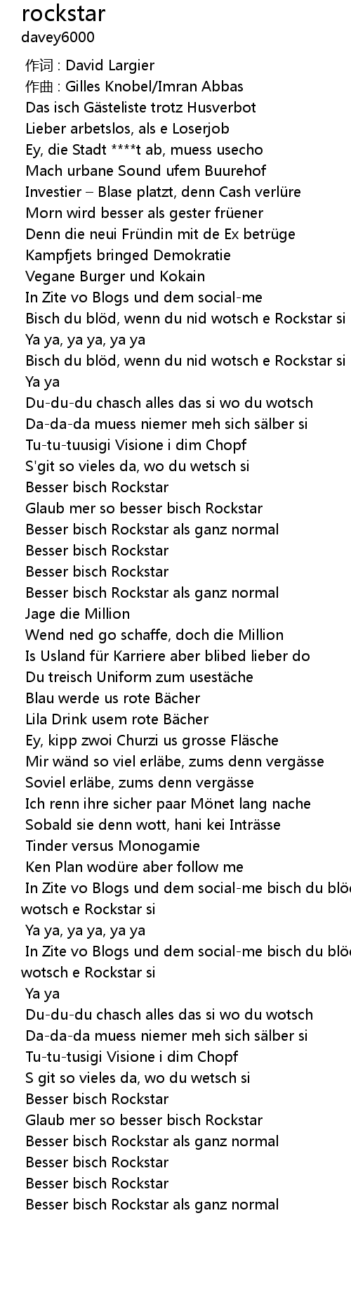 | [00:36.936] | Bisch du bl d, wenn du nid wotsch e Rockstar si |