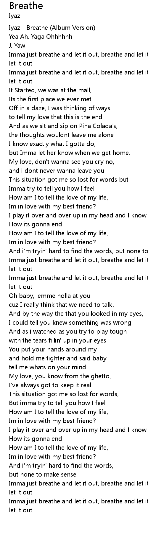 | [00:18.44] | Imma just breathe and let it out, breathe and let it out, breathe and let it out |