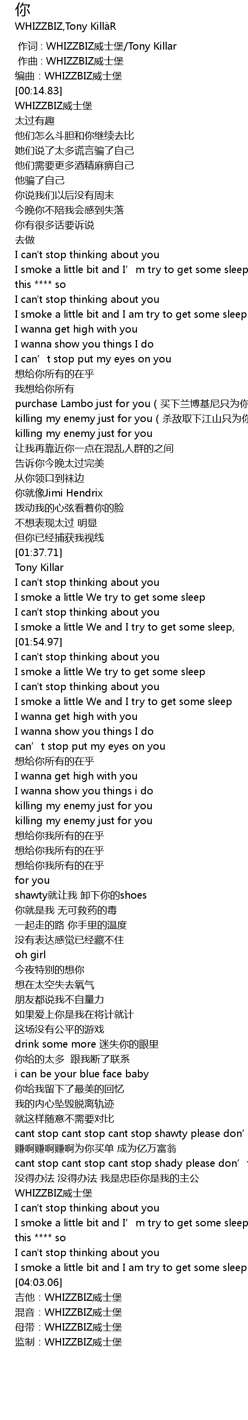 | [00:00.000] | 作词 : WHIZZBIZ威士堡/Tony Killar |