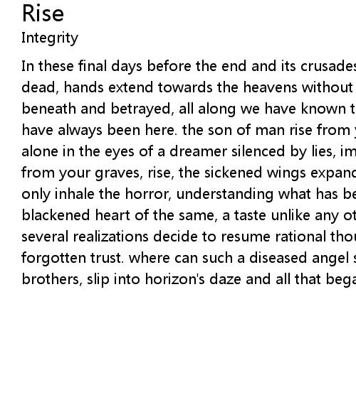 In these final days before the end and its crusades voiceless among the walking dead, hands extend towards the heavens without wings nor soul of light masked beneath and betrayed, all along we have known that this day would come, signs have always been here. the son of man rise from your graves, rise salvation. alone in the eyes of a dreamer silenced by lies, imprisoned by your fear. rise from your graves, rise, the sickened wings expand, cowering in their shadow. i only inhale the horror, understanding what has become and what soon shall be. blackened heart of the same, a taste unlike any other, awake like never before. several realizations decide to resume rational thought. much later it is forgotten trust. where can such a diseased angel solitude, preyed upon by our brothers, slip into horizon's daze and all that began anew |