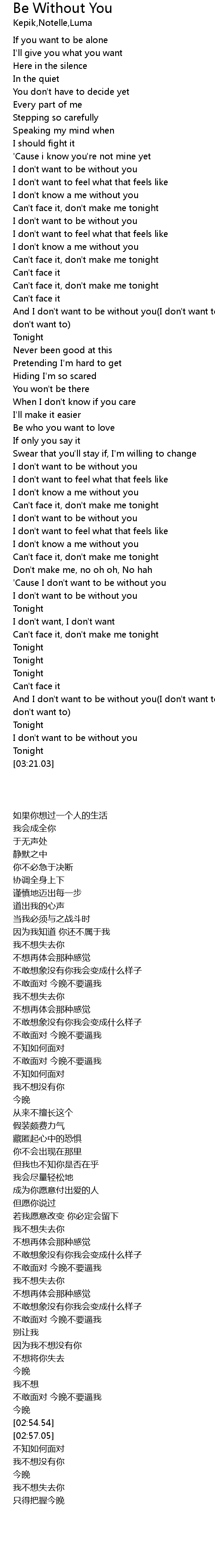 | [01:19.90] | And I don't want to be without you(I don't want to, I don't want to, I don't want to) |
