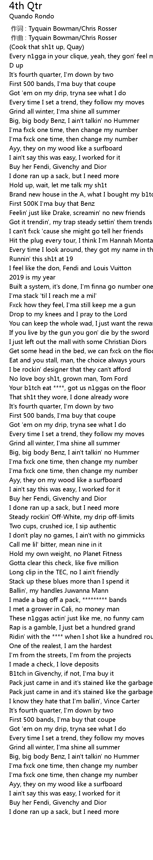 | [01:53.407] | Ridin' with the **** when I shot like a hundred rounds |
