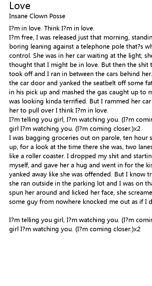 I was bagging groceries out on parole, ten hour shifts taken its toll I glanced up, for a look at the time there she was, two lanes from mine, my stomach fell like a roller coaster. I dropped my shit and starting walking close to introduce myself, and gave her a hug and went in for the kiss but I got no love. She yanked away like she was offended. But I know true love and she?s pretending, she ran outside in the parking lot and I was on that ass, she was ****ing hot. I spun her around and licked her face, she screamed, hit me with a can of mase, some guy from nowhere knocked me out as if I don?t know what true love is about. |