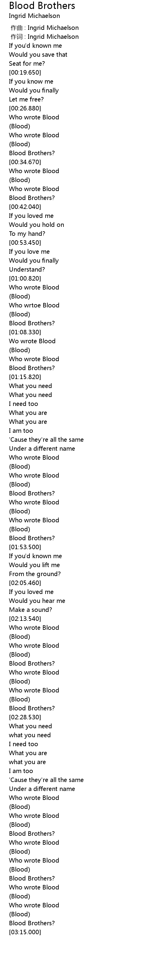 | [03:01.400] | Who wrote Blood |