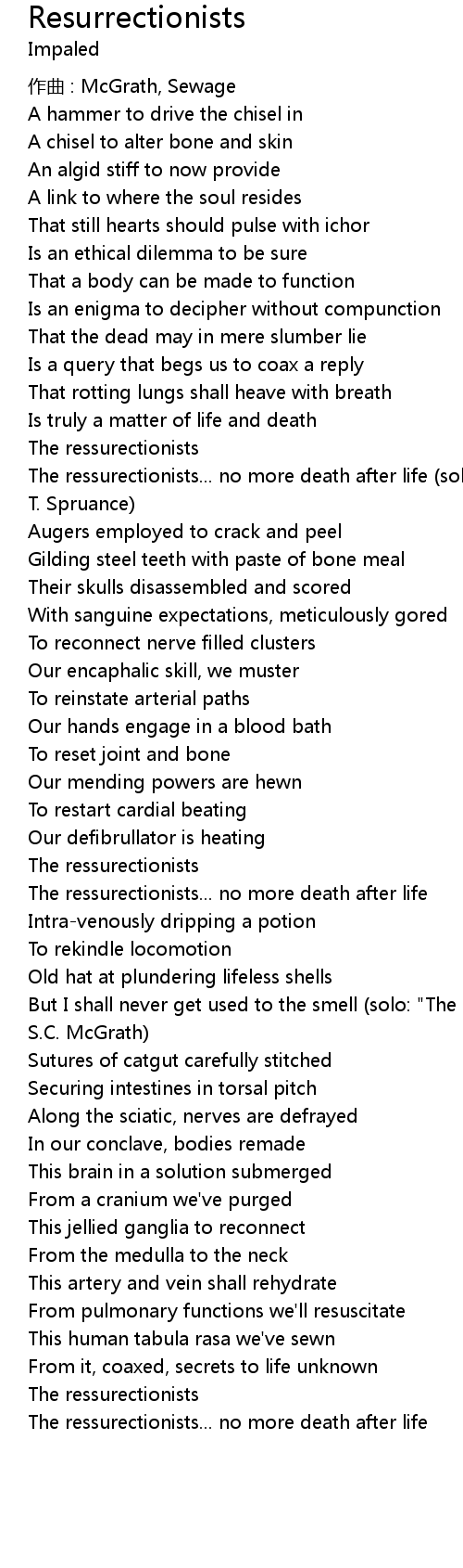| The ressurectionists... no more death after life (solo: "Just a Few Stitches" by T. Spruance) | |