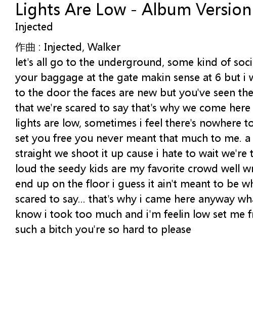 | let' s all go to the underground, some kind of social lost and found check all your baggage at the gate makin sense at 6 but i won' t by 8 pulled like a magnet to the door the faces are new but you' ve seen them before spit out the truth that we' re scared to say that' s why we come here anyway i like to live where the lights are low, sometimes i feel there' s nowhere to go. set you alight and i' ll set you free you never meant that much to me. a couple shots and we' re feelin straight we shoot it up cause i hate to wait we' re talkin shit and we talk it loud the seedy kids are my favorite crowd well write your number down for me to end up on the floor i guess it ain' t meant to be what' s her name? well i' m scared to say... that' s why i came here anyway what' s my game? you don' t want to know i took too much and i' m feelin low set me free cause i' m on my knees it' s such a bitch you' re so hard to please |