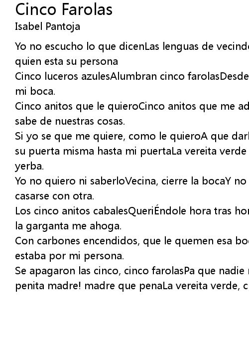 | Se apagaron las cinco, cinco farolasPa que nadie me vea, llorando a solasAy que penita madre! madre que penaLa vereita verde, cuaja de yerbaCuaja de yerba. |