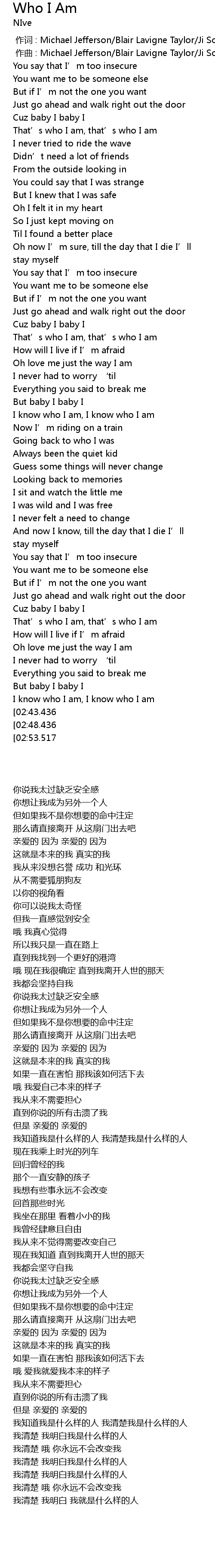 | [03:04.227][02:43.436] | I know, I know who I am |