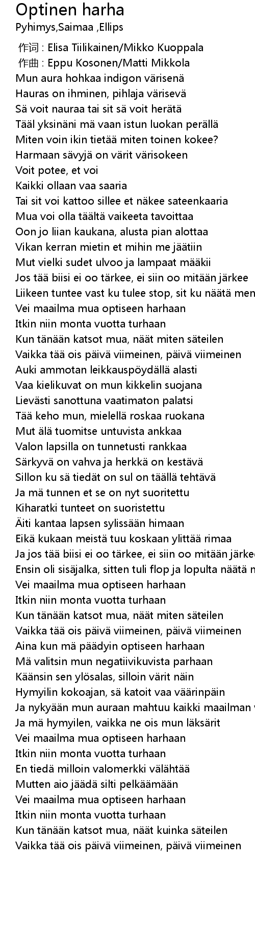 | [00:00.000] | 作词 : Elisa Tiilikainen/Mikko Kuoppala |
