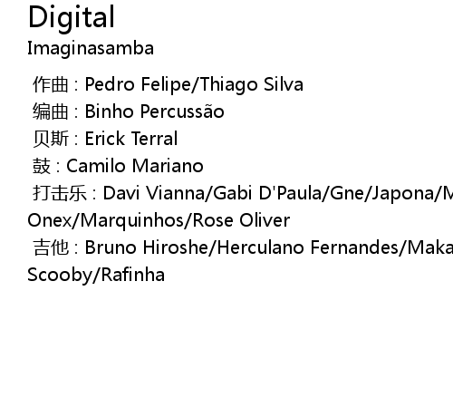 | [00:00.000] | 打击乐 : Davi Vianna/Gabi D'Paula/Gne/Japona/Marcos Onex/Marquinhos/Rose Oliver |