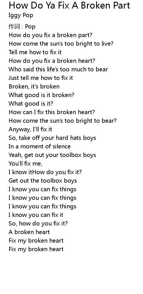 | Song | How Do Ya Fix A Broken Part |