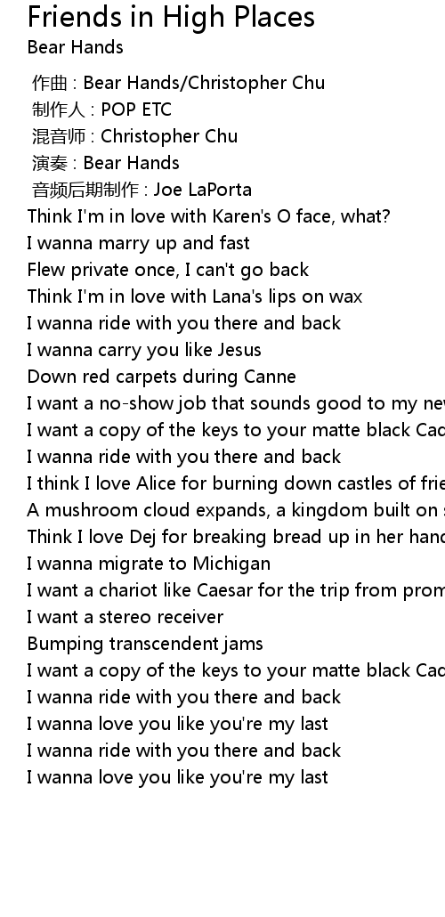| [00:00.000] | zuo qu : Bear Hands Christopher Chu |