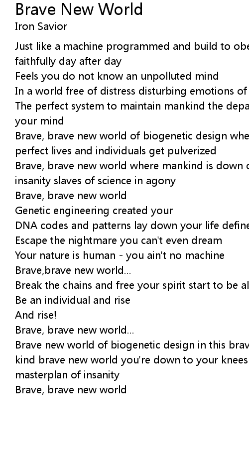 Brave new world of biogenetic design in this brave new world no emotions of any kind brave new world you're down to your knees in this brave new world the masterplan of insanity |