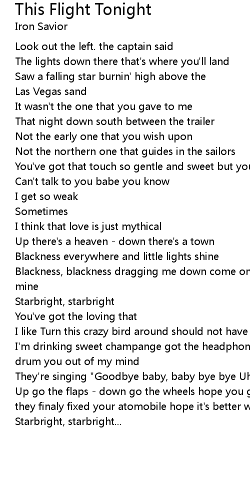 Up go the flaps - down go the wheels hope you got your heat turned on baby hope they finaly fixed your atomobile hope it's better when we meet again babe |