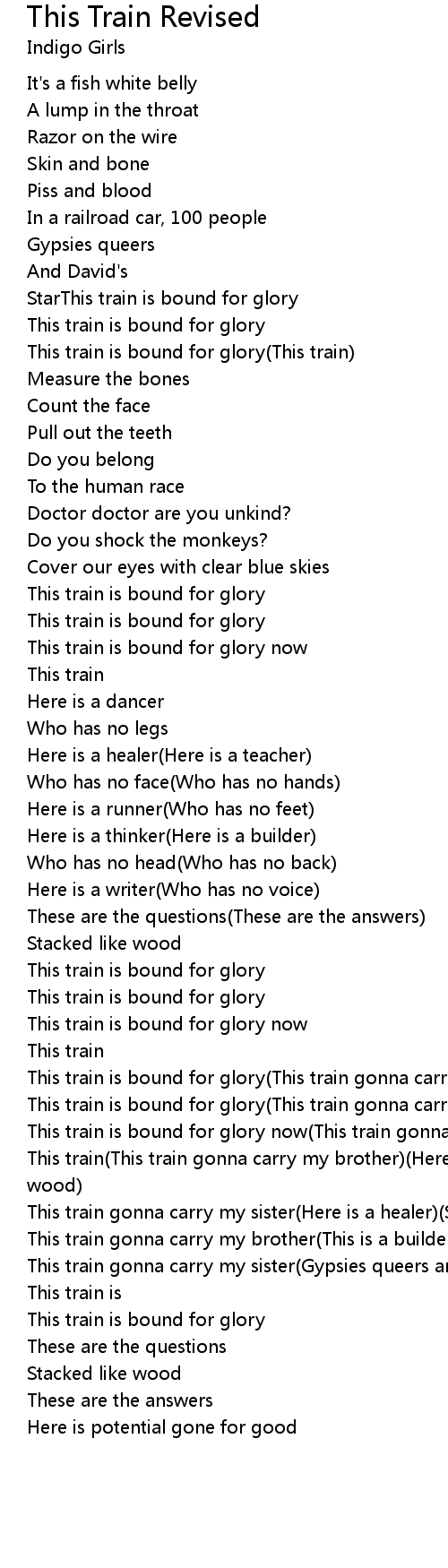 This train(This train gonna carry my brother)(Here is a teacher)(Stacked like wood) |