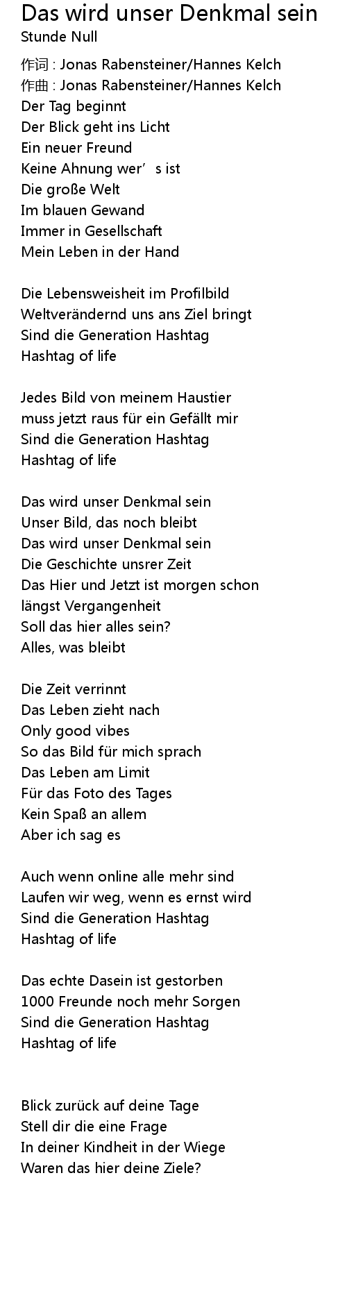 | Song | Das wird unser Denkmal sein |