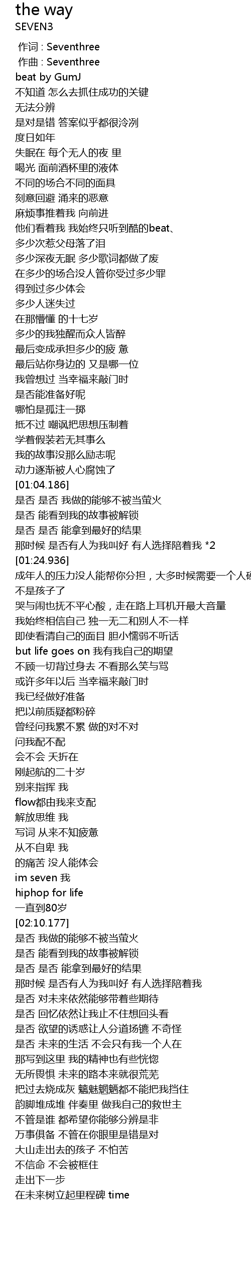 | [02:40.176] | 韵脚堆成堆 伴奏里 做我自己的救世主 |