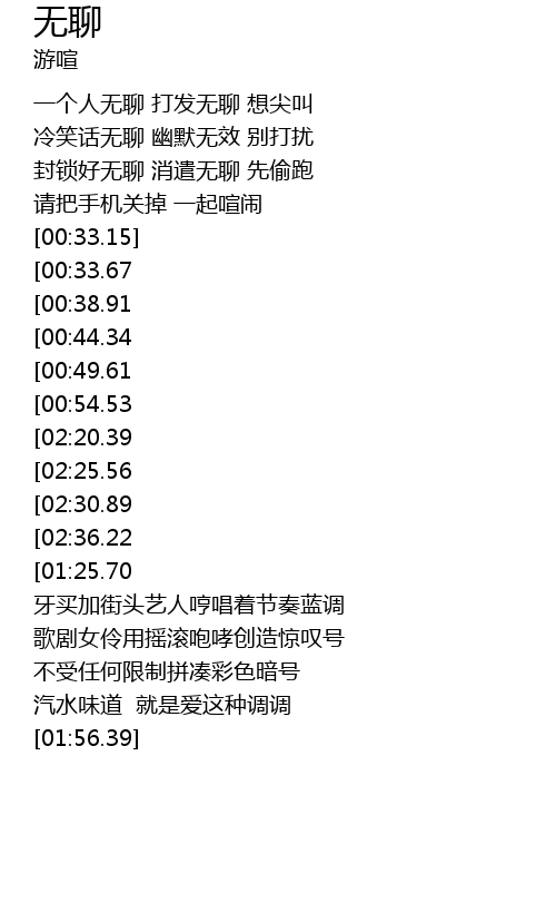 | [02:41.92][02:20.39][00:54.95] | 一个人无聊 打发无聊 想尖叫 |