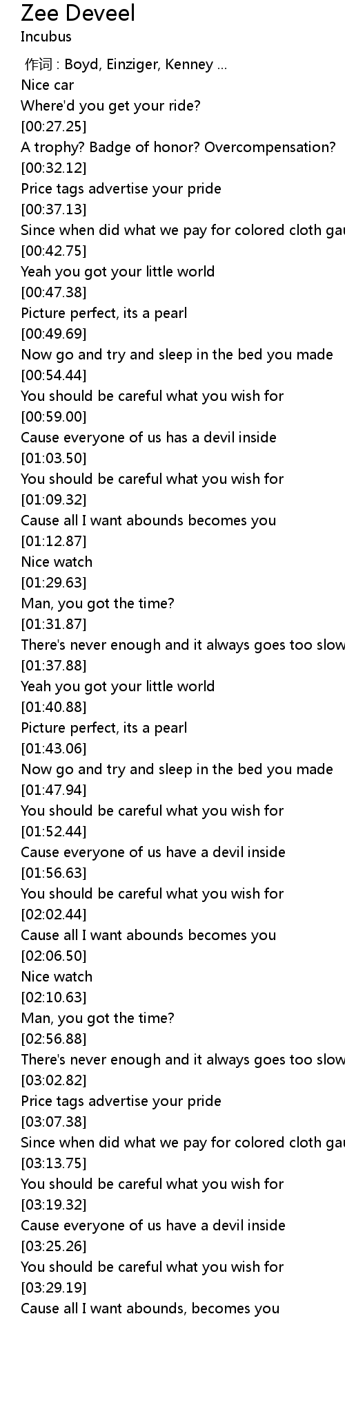 | [00:00.00] | 作词 : Boyd, Einziger, Kenney ... |