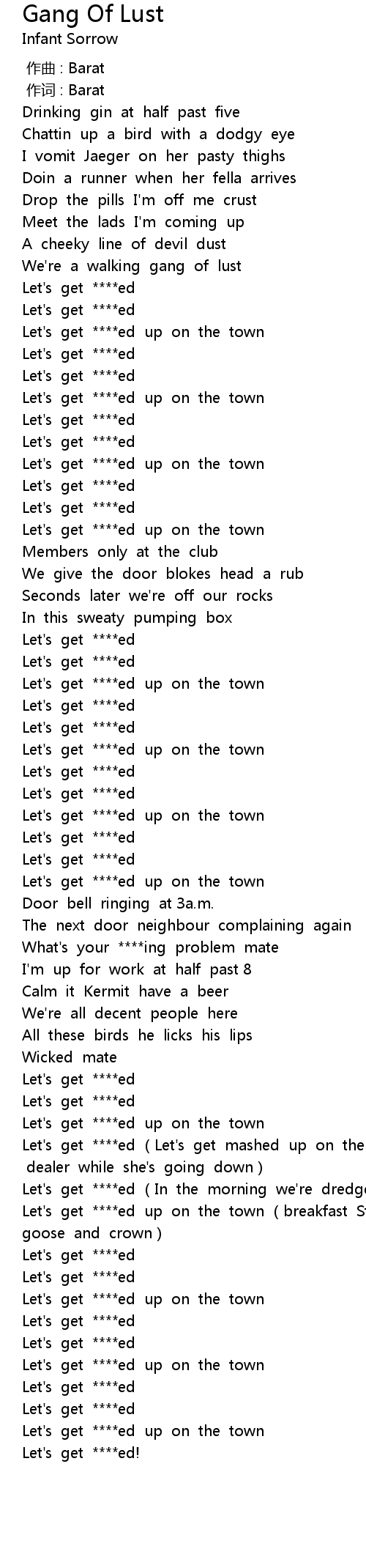 | [01:42.737] | Let's get ****ed (In the morning we're dredged in brown) |