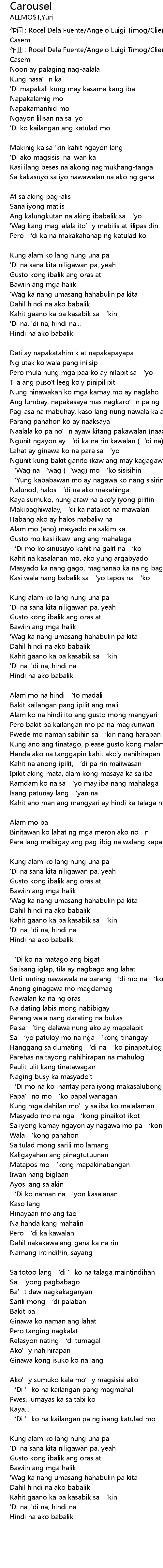 | 作词 : Rocel Dela Fuente/Angelo Luigi Timog/Clien Alcazar/Elvin Santos/Jomuel Casem | |