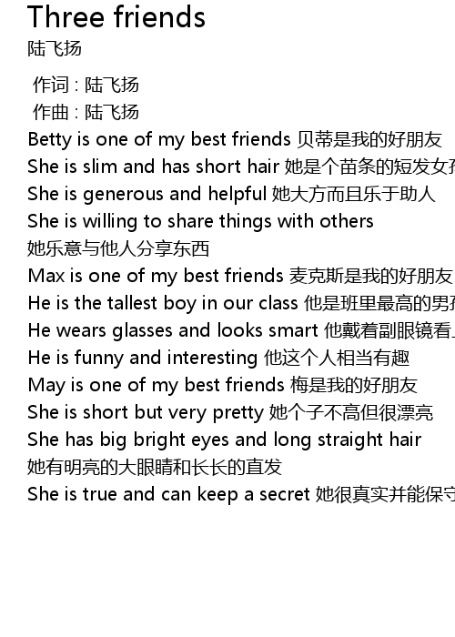 | [00:19.52] | Betty is one of my best friends bei di shi wo de hao peng you |