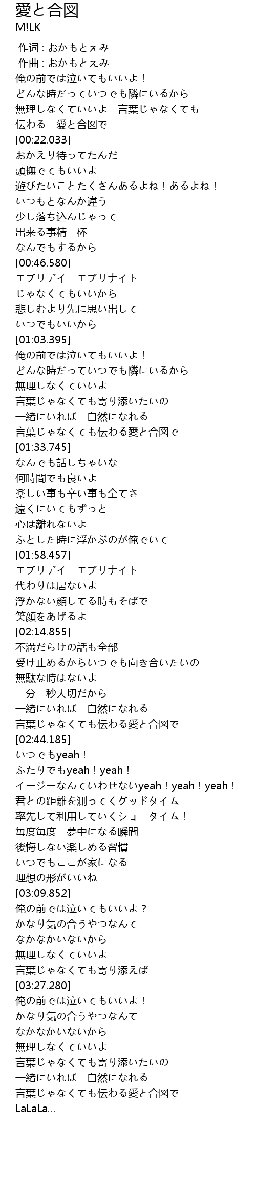 | [03:50.177] | 言葉じゃなくても伝わる愛と合図で |