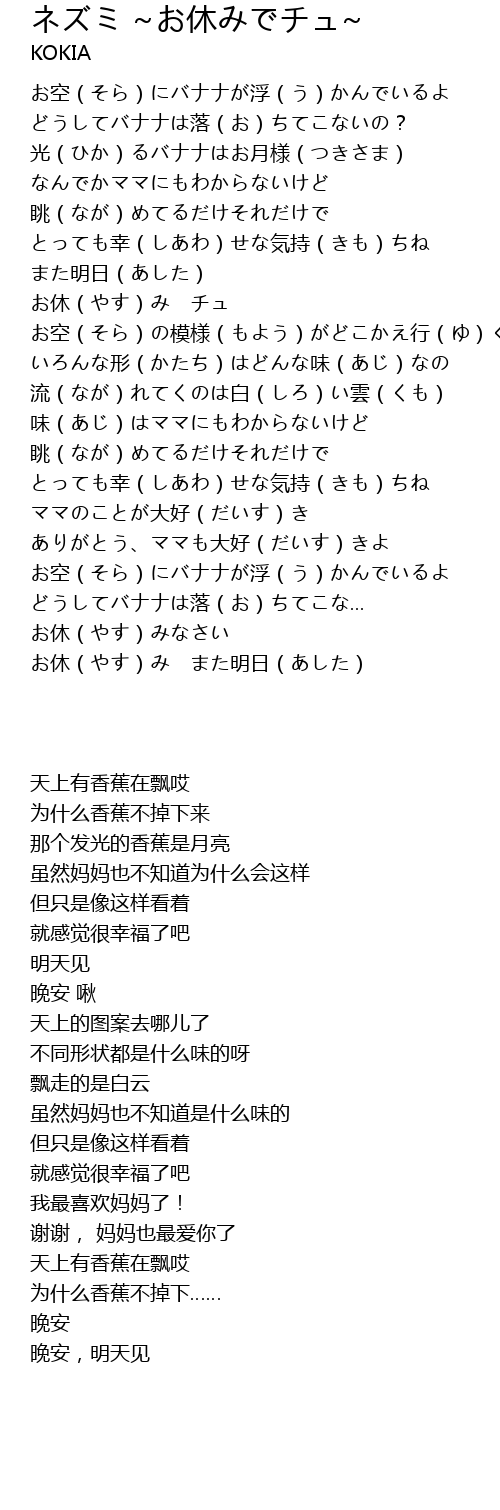 | [00:17.000] | お空(そら)にバナナが浮(う)かんでいるよ |