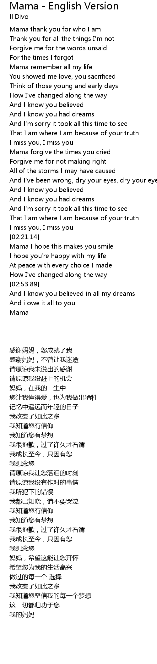 | [00:10.14] | Mama thank you for who I am |