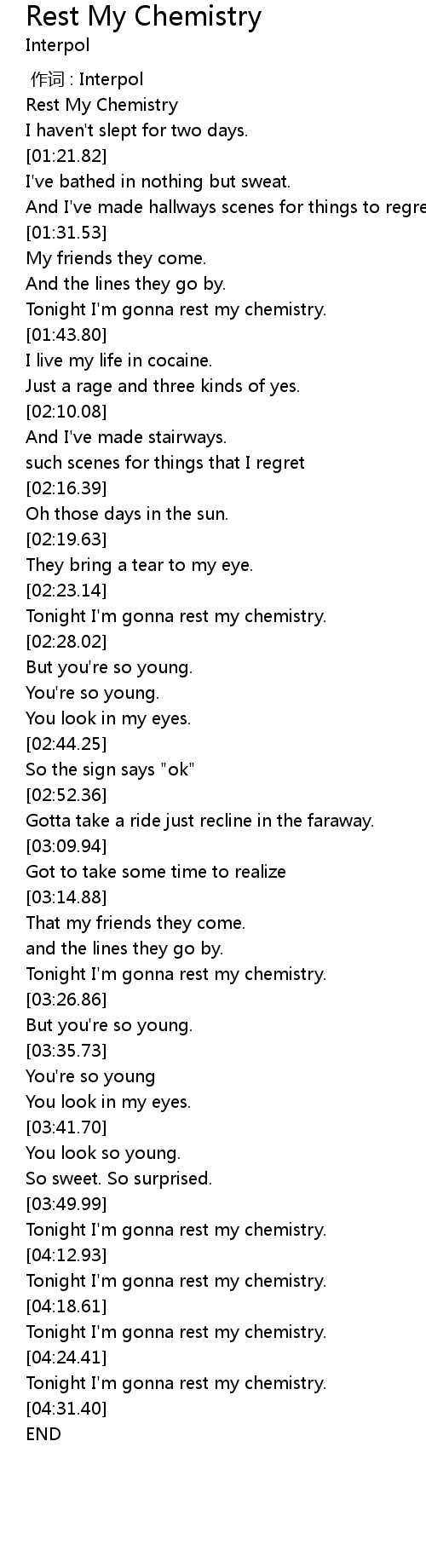 | [04:20.36] | Tonight I'm gonna rest my chemistry. |
