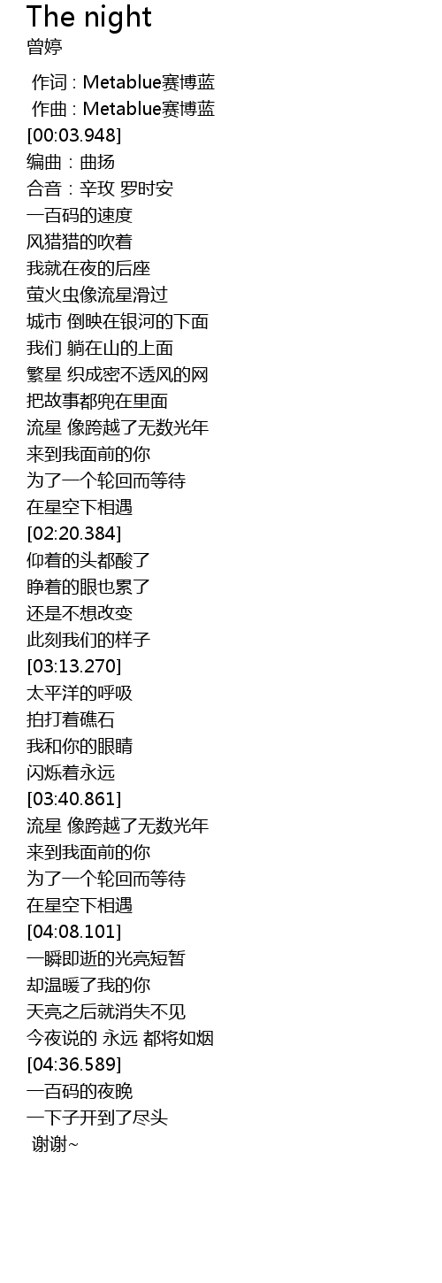 | [04:51.109] | yī bǎi mǎ de yè wǎn |