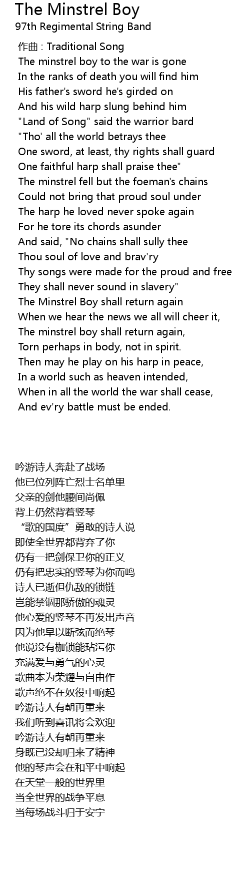 | [01:38.406] | The minstrel fell but the foeman' s chains |