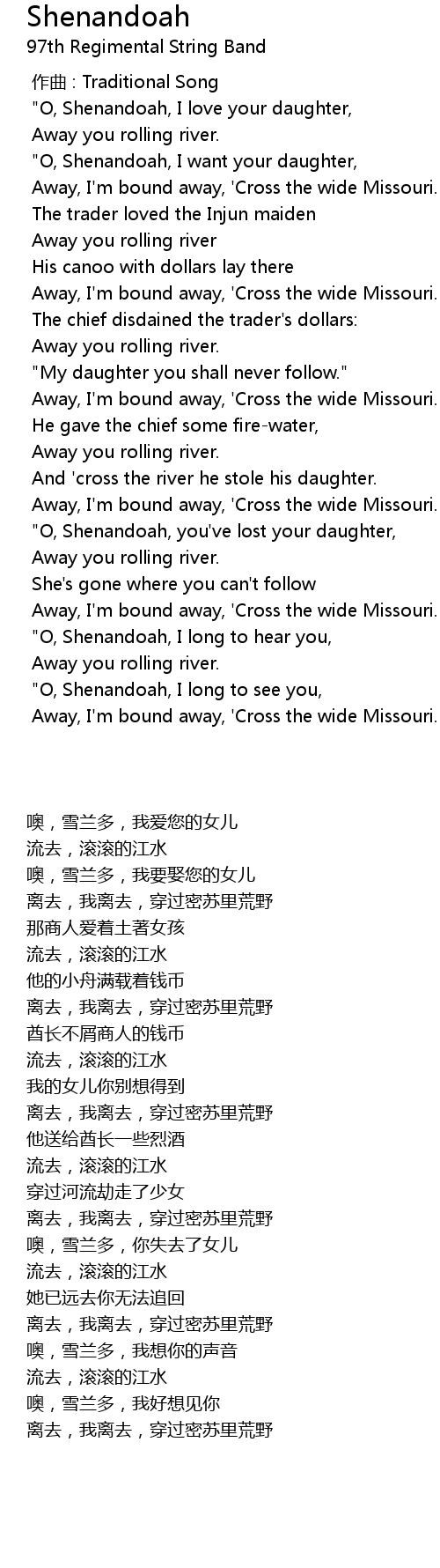 | [00:43.230] | " O, Shenandoah, I want your daughter, |