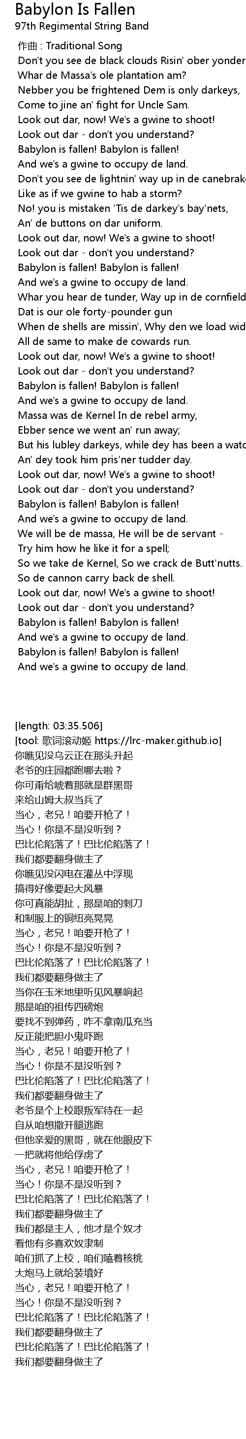 | [00:36.428] | And we's a gwine to occupy de land. |