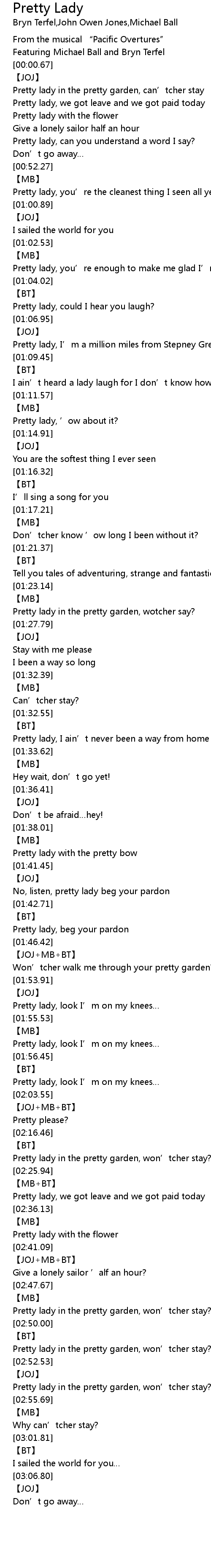 | [02:47.67] | Pretty lady in the pretty garden, won' tcher stay? |