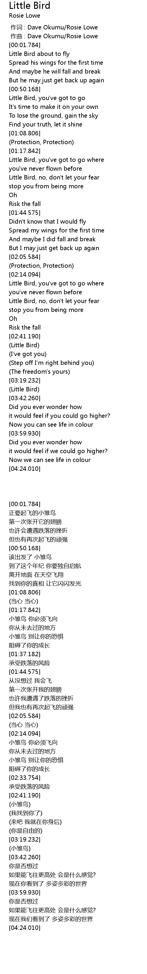 | [02:24.181] | Little Bird, no, don't let your fear |