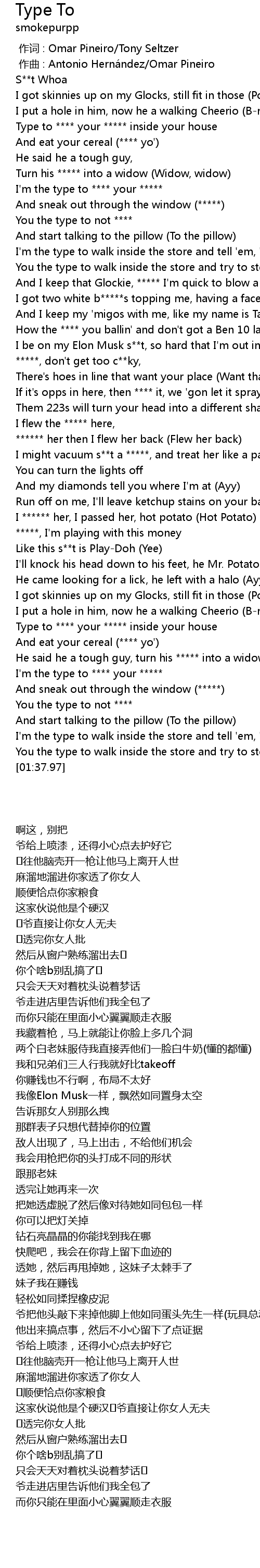 | [00:34.58] | I got two white b*****s topping me, having a face-off (Face-off) |