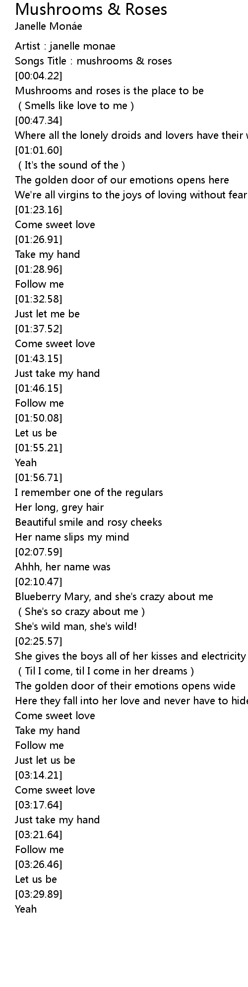 | [00:35.50] | Mushrooms and roses is the place to be |