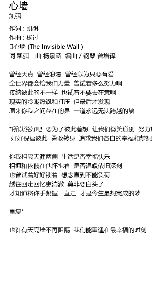 | 词 凯弭 曲 杨景涵 编曲/钢琴 曾增译 | |