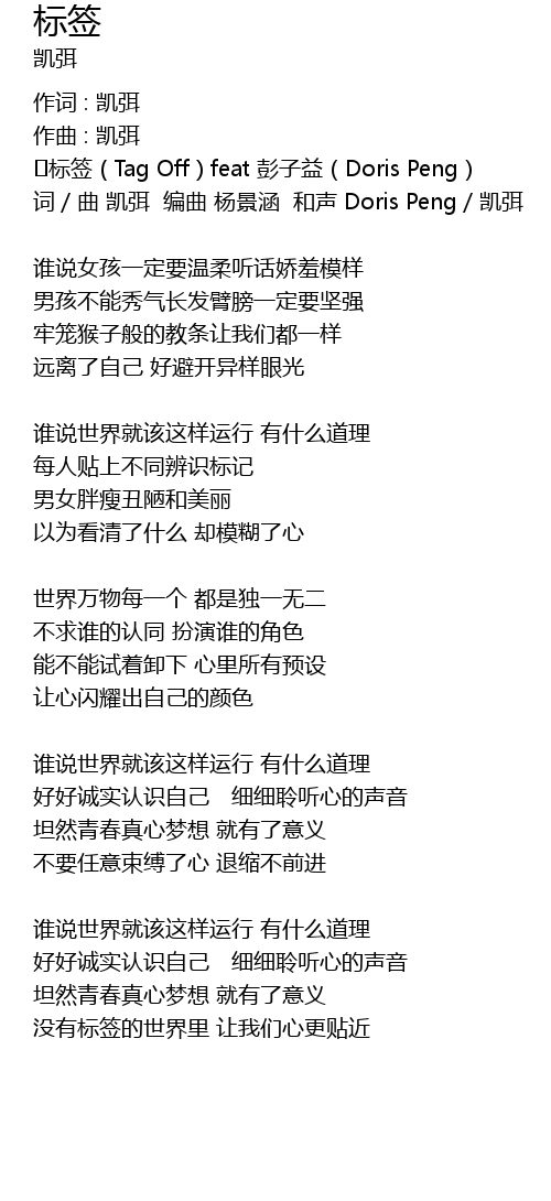 | 词/曲 凯弭 编曲 杨景涵 和声 Doris Peng/凯弭 | |