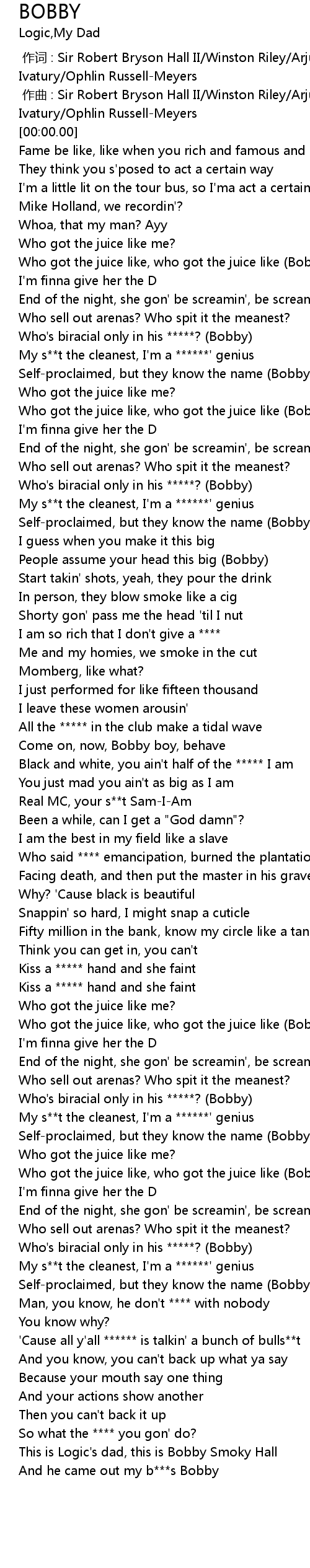 | [02:04.230] | Who got the juice like, who got the juice like Bobby |