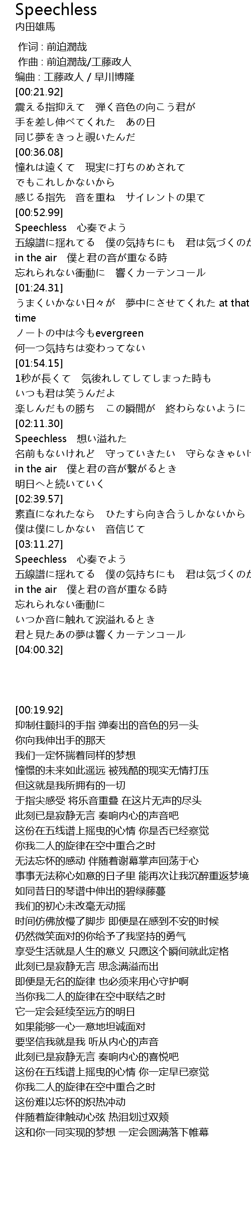 | [00:53.36] | Speechless 心奏でよう |