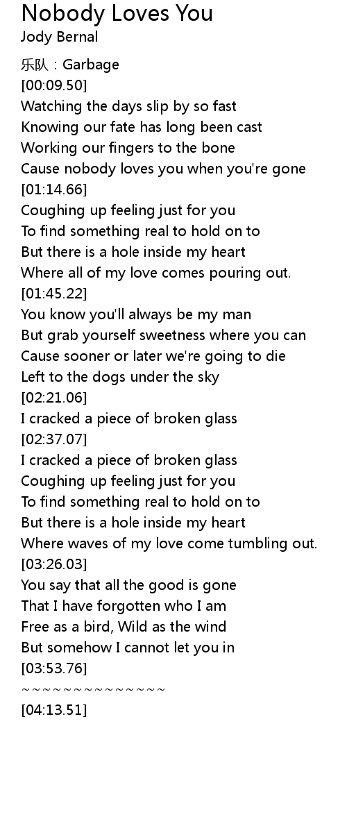 | [01:09.16] | Cause nobody loves you when you' re gone |