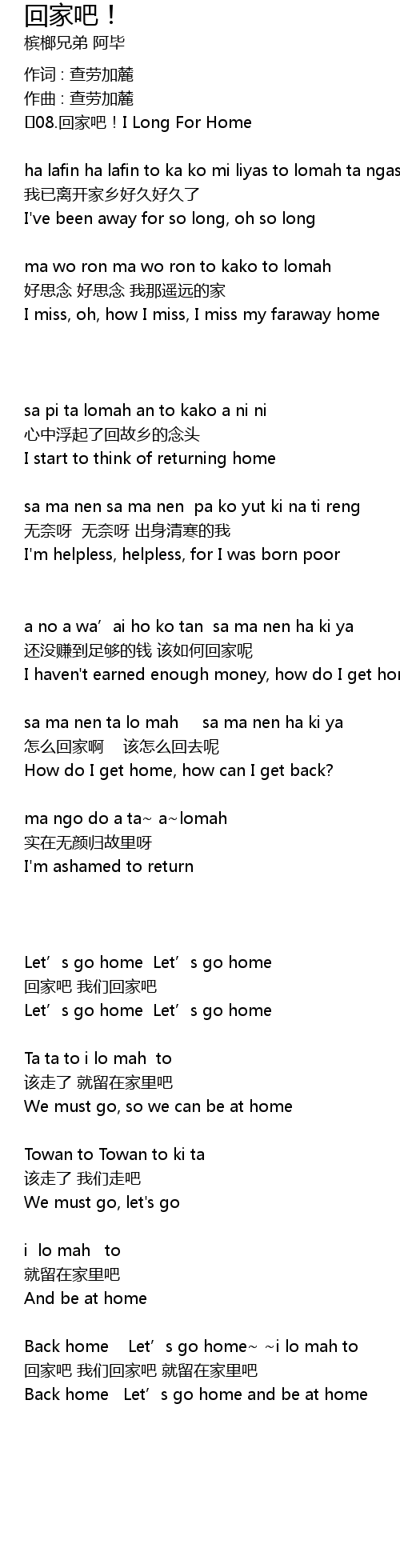 | hui jia ba wo men hui jia ba jiu liu zai jia li ba | |